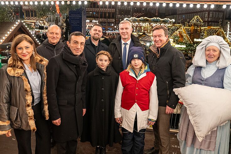 Die drei Bergwinkel-Bürgermeister Thomas Henfling (Vierter von links), Christian Zimmermann (Vierter von rechts) und Matthias Möller (Zweiter von rechts) haben gemeinsam mit dem Frankfurter Oberbürgermeister Mike Josef (Dritter von links), Vertretern der Tourismus + Congress GmbH und den Steinauer Märchenfiguren den Weihnachtsmarkt eröffnet. Fotonachweis: Bensing & Reith