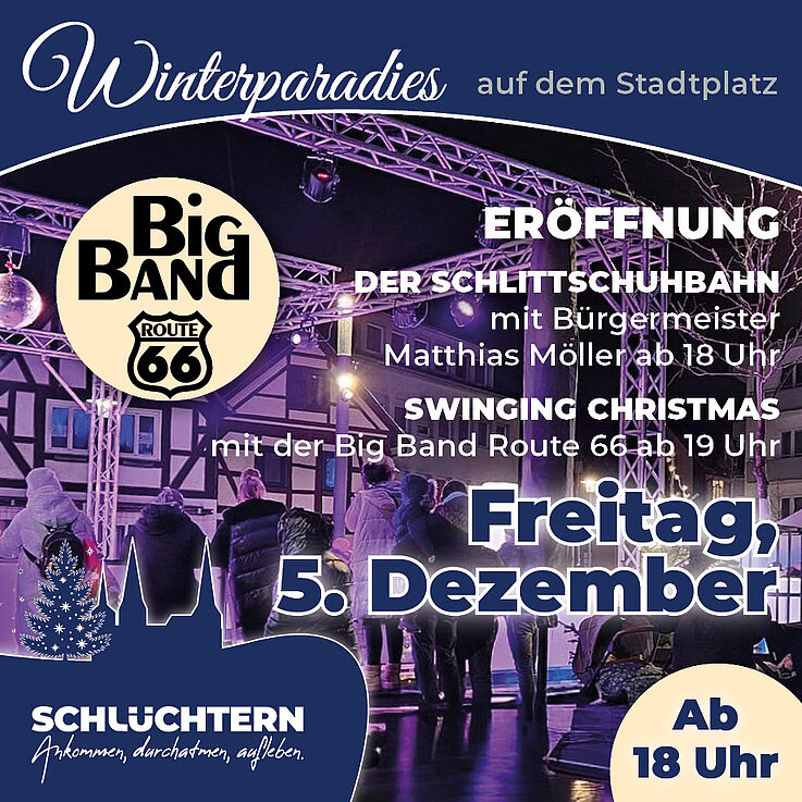 Am 5. Dezember ab 18 Uhr eröffnet Bürgermeister Matthias Möller die Schlittschuhbahn auf dem Stadtplatz, und ab 19 Uhr sorgt die Big Band Route 66 mit „Swinging Christmas“ für Stimmung.