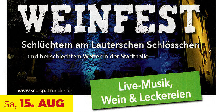 Weinfest des SCC 15.08.2026 in Schlüchtern am Lauterschen Schlösschen ... und bei schlechtem Wetter in der Stadthalle Dateien Weinfest_15.08.26.pdf 1 MB zurück