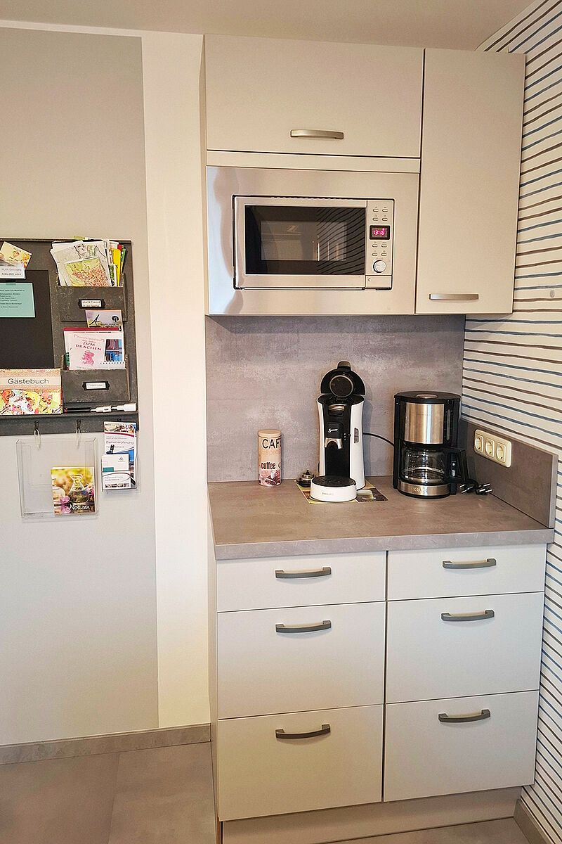 Man kann also außer dem Frühstück auch andere Mahlzeiten zubereiten. Kleinere Mengen an Kaffeepads, Kaffeepulver und Tee stehen ebenfalls immer für die Gäste zur Verfügung.