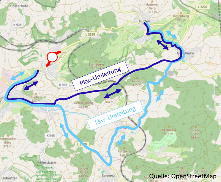 Die folgende Übersichtskarte zeigt die aktuell eingerichteten Umleitungsstrecken für Pkw und Lkw: