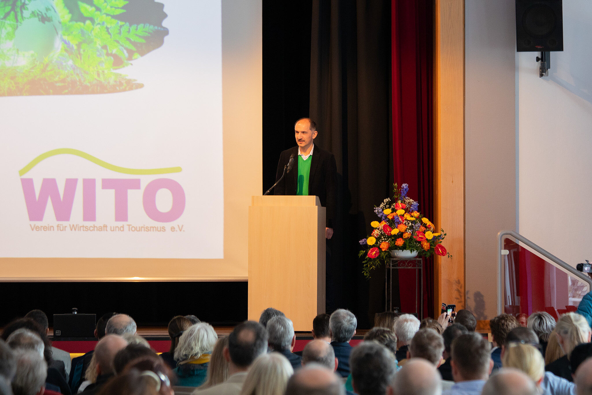Nach Möllers Ansprache, schloss der Vorsitzende des Vereins für Wirtschaft und Tourismus e. V. (WITO) Axel Ruppert als nächster an. Auch sein Beitrag drehte sich um die positive Entwicklung des Vereins, welcher mittlerweile über 200 Mitglieder zählt und mit seinem „Schlüchtern Gutschein“ über eine Millionen Euro Umsatz in die Stadt gebracht hat. Das Projekt Klimapakt für Schlüchtern stellte einen weiteren Fokus dar. Nachdem das erste Waldstück in Angriff genommen worden war, kommen 2023 zahlreiche weitere zukunftstaugliche Waldstücke hinzu. Ruppert rief noch einmal dazu auf, dass sich auch private Waldbesitzer gerne beim Verein melden könnten, da durch das ausgearbeitete Konzept ebenso Fördermittel eingeholt werden, welche eine kostenfreie Umgestaltung auch im privaten Rahmen ermöglichen können.