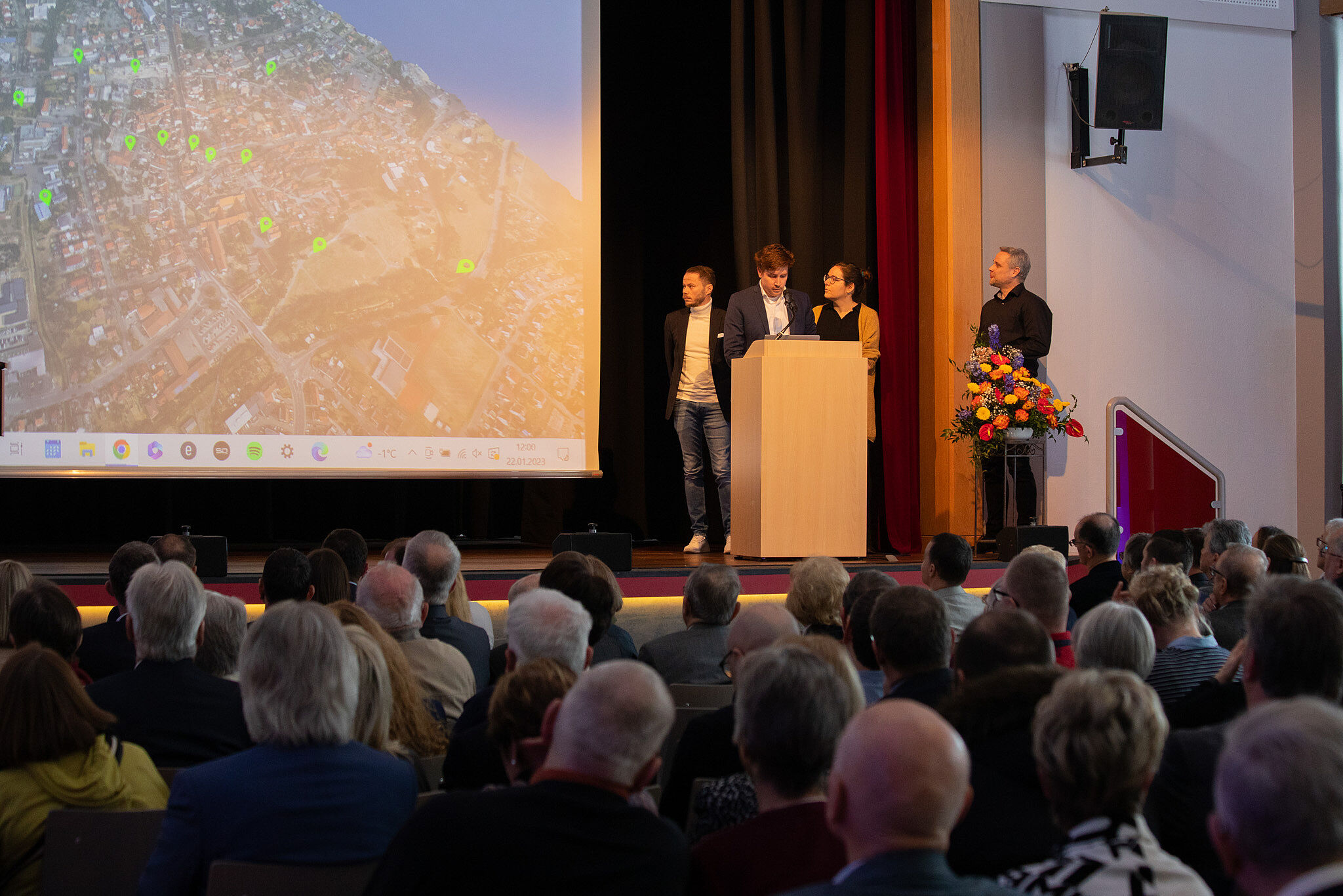 Zum Abschluss präsentierten Vertreter der NH Projektstadt GmbH das neue virtuelle Bürgerbeteiligungsmodell. Unter <https://schluechtern.yourvoice-projektstadt.de/> ist ab sofort ein digitaler Zwilling der Stadt Schlüchtern für alle Interessierten erreichbar. Hier können verschiedene Projekte interaktiv erlebt werden, zudem können die Bürger und Bürgerinnen ebenso ihre Meinung zu den einzelnen Projekten hinterlassen. Dieses virtuelle Modell soll in Zukunft aktiv den Austausch zu den geplanten Projekten der Stadt Schlüchtern ermöglichen und das Meinungsbilder der Bürgerinnen und Bürger in jegliche Entscheidungsprozesse integrieren. Als bauliches Highlight stellte Thomas Rau in diesem Zusammenhang noch die klimaschützende Umgestaltung des Schulhofes der Stadtschule Schlüchtern heraus.