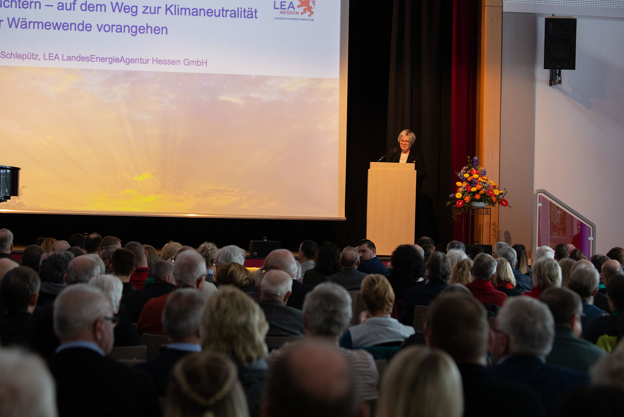 Den Kern des Jahresempfangs bildete der Fachvortrag „Umgang mit Energie – Ein Praxistipp“ von Melanie Schlepütz von der LandesEnergieAgentur Hessen GmbH – kurz LEA. Sie berichtete über die tägliche Arbeit in der LEA und zeigte auf, wie einfache Tipps, wie das Isolieren von Heizungsleitungen oder das Senken der Raumtemperatur um nur 1 Grad direkte Auswirkungen auf den energetischen Fußabdruck des Landes Hessen haben. Ziel der LandesEnergieAgentur ist es den Bürgerinnen und Bürgern eine Anlaufstelle zu bieten und durch eine gezielte Energieberatung über Möglichkeiten und Fördermittel zu informieren. Hierbei kündigte Sie an am Helle Markt diesen Jahres mit ihren Kollegen und Kolleginnen ein Projekt für die Stadt Schlüchtern starten zu wollen.