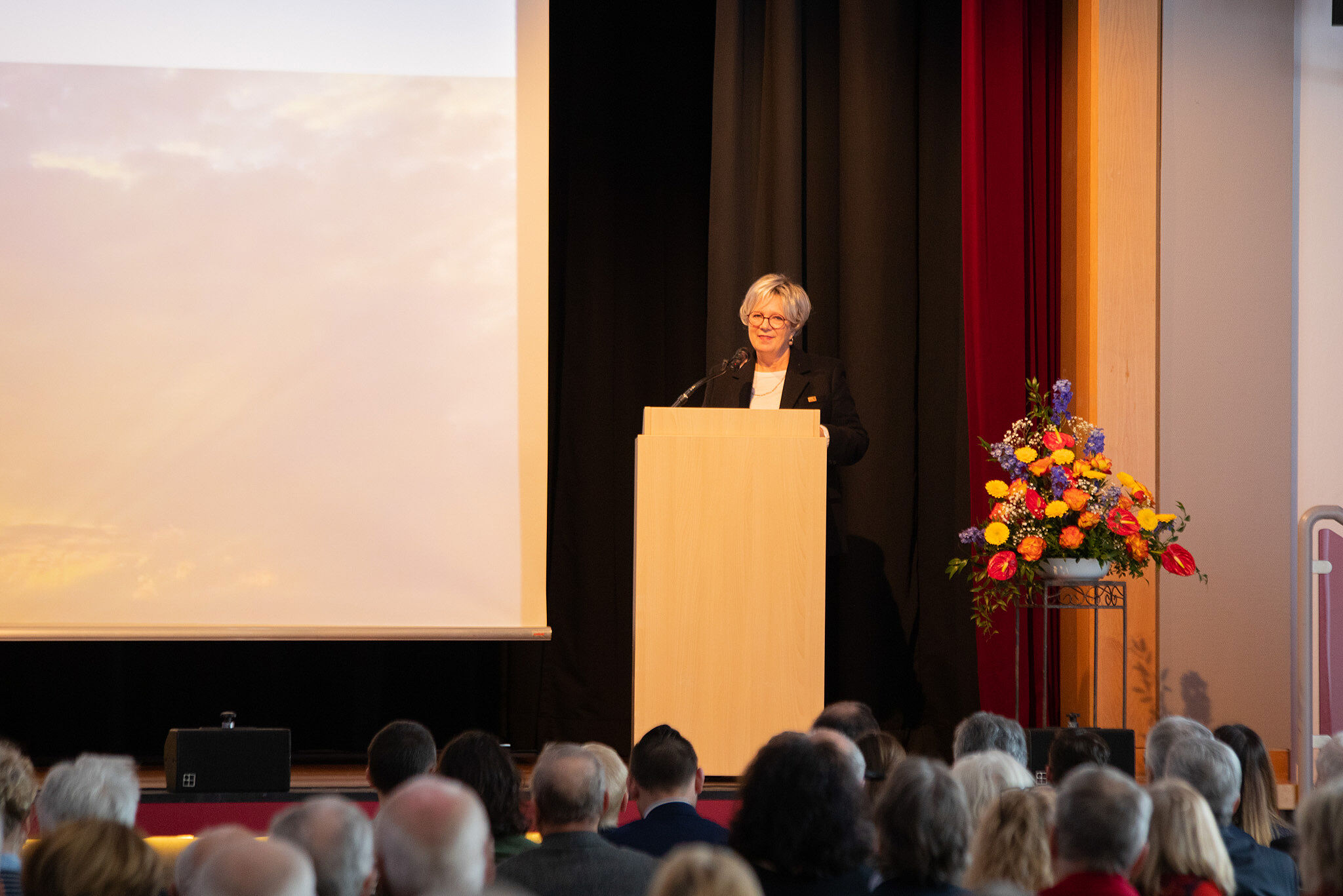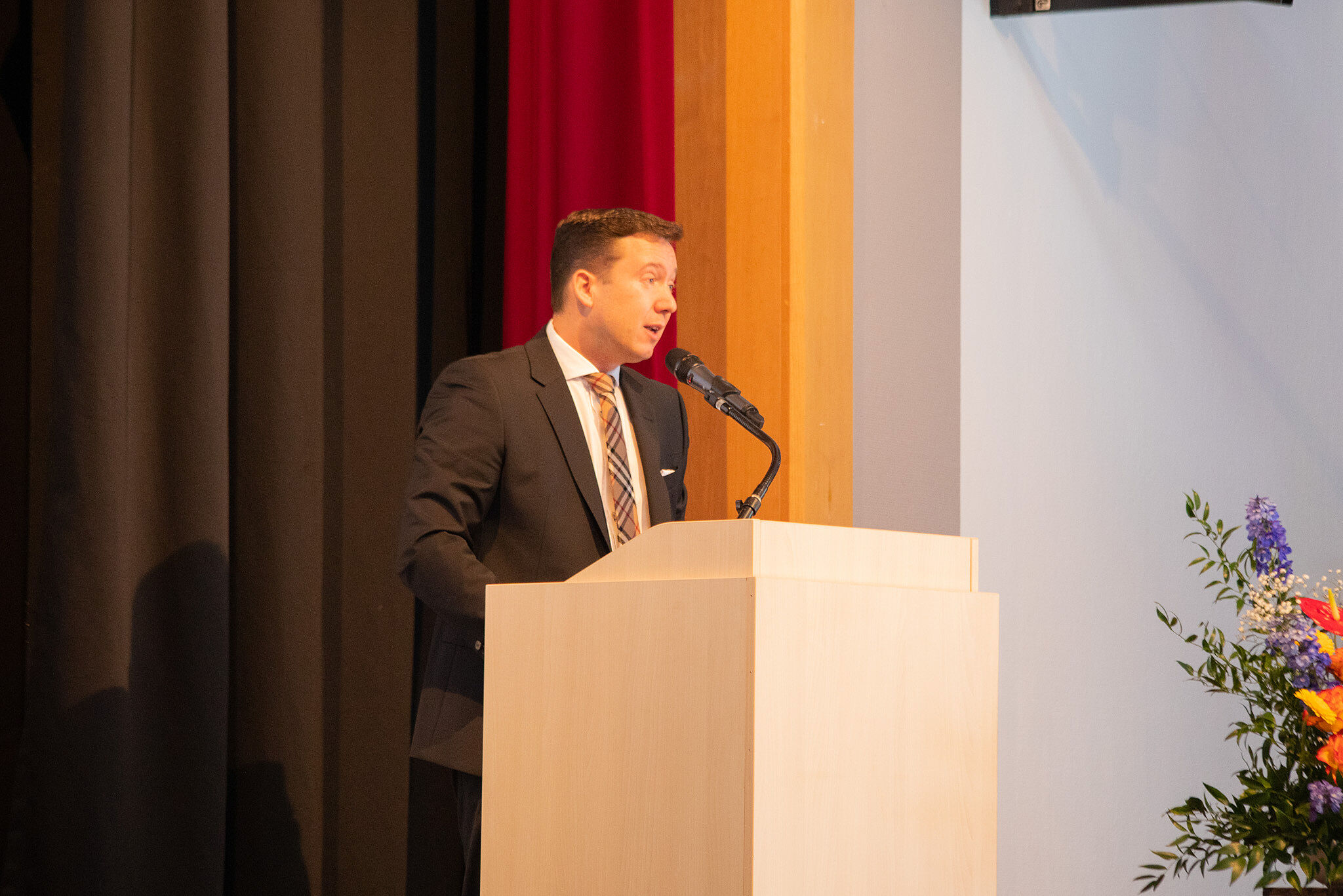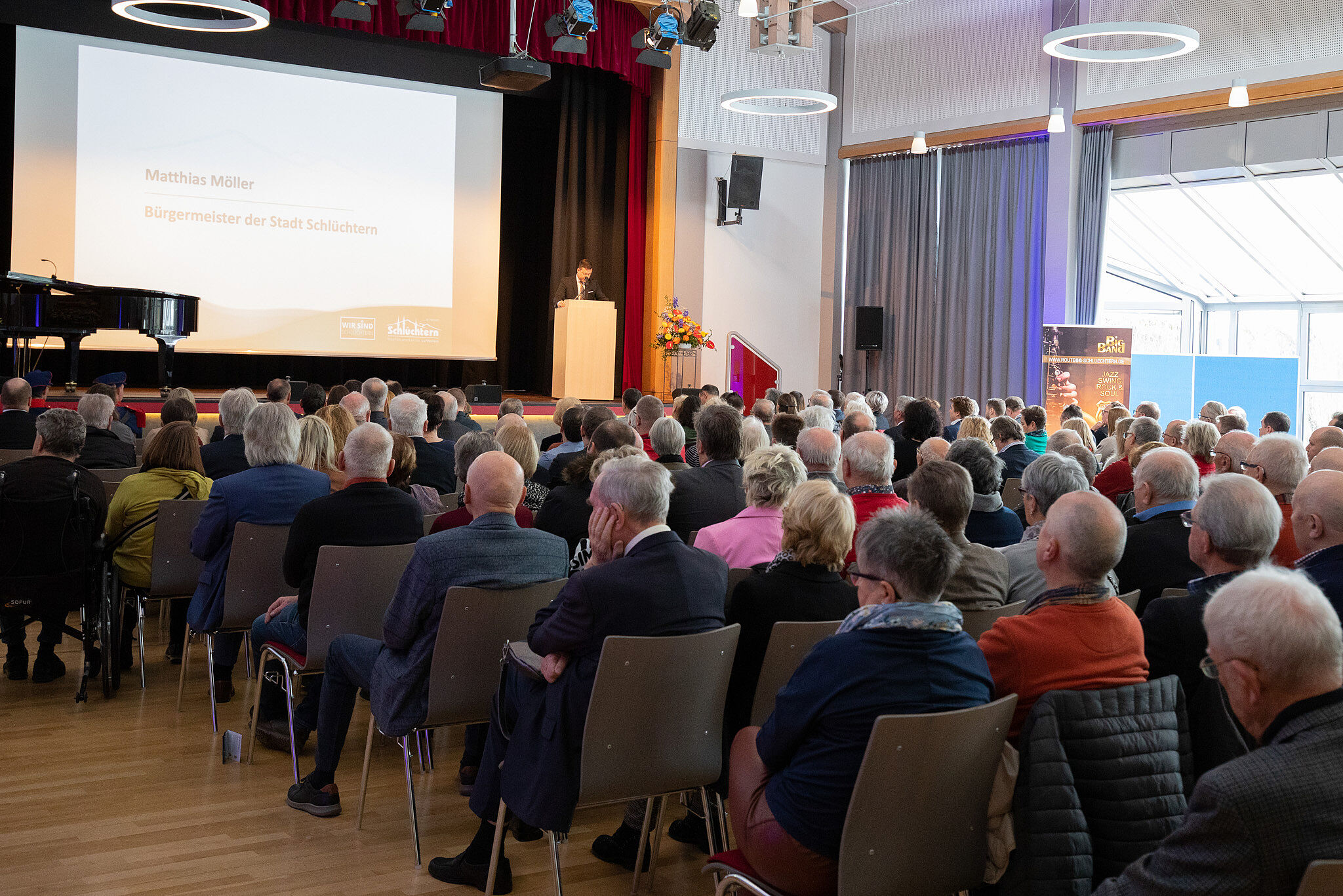 Mit einem humorvollen und heimatverbundenen Grußwort, voller vertrauter Redewendungen und Anekdoten, eröffnete Möller den Jahresempfang: Ob es darum ging wie eine Offenbacher Bauunternehmung das Langerareal „Nass wegknabbern“ wollte oder Erinnerungen des Kalten Markts geteilt wurden, Matthias Möller ließ das Jahr in all seinen Facetten Revue passieren. Im Fokus der Einleitung stand das gemeinsam Erreichte – die Transformation der Stadt Schlüchtern zur beruflichen Einpendler-Stadt, die hohen Gewerbesteuereinahmen und natürlich der erfolgreiche Fortschritt der zahlreichen Bauprojekte. Ein Raunen ging durch die Menge, als Matthias Möller sein neues Ziel für die Stadt Schlüchtern formulierte. „Wenn man sieht, dass wir so viel erreicht haben, obwohl es Wetten darüber gab, dass wir mit unseren Projekten scheitern, dann kann man sich auch neue Ziele setzen. Wie wäre es zum Beispiel mit dem Hessentag in Schlüchtern? Laut Wikipedia ist der Austragungsort für 2028 noch vakant“ , so Möller wörtlich.