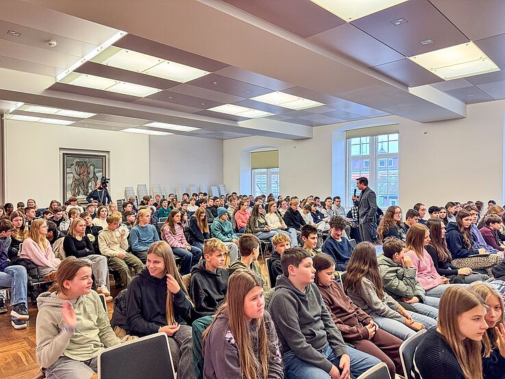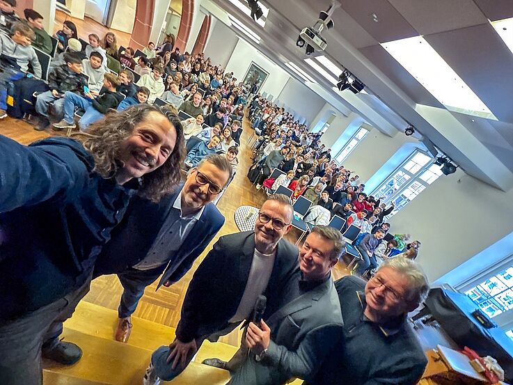 Mehr als 200 Schülerinnen und Schüler waren in der Aula, dazu mehr als 600 Kinder und Jugendliche, die per Livestream in ihren Klassenräumen zugeschaltet waren. „Das ist der größte Talk, den wir je veranstaltet haben“, frohlockte Moderator Nico Bensing von der Agentur Bensing & Reith. Gemeinsam mit Bürgermeister Matthias Möller hat er das Format des Bürgertalks entwickelt, das jetzt auch seinen Weg in die Schulen gefunden hat.