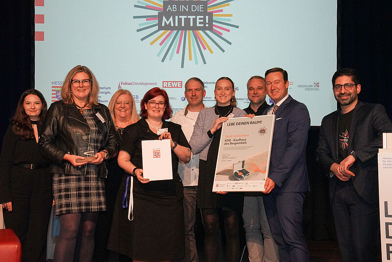 Celina Struck (links) vom Handelsverband Hessen und Hessens Wirtschaftsminister Kaweh Mansoori (rechts) überreichten der Schlüchterner Delegation den „Ab in die Mitte“-Preis (weiter von links): Kerstin Baier-Hildebrand, Lydia Kohlhepp, Sabrina Lauster, Tobias Orth, Anna-Lena Loos, Thomas Rau und Bürgermeister Matthias Möller.